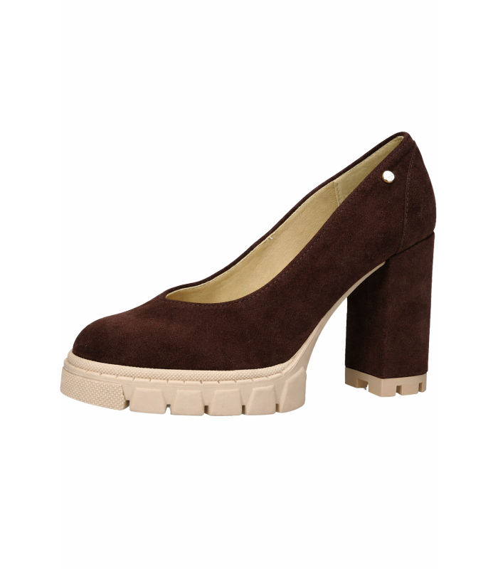 Vykrojené hnědé lodičky na hrubém podpatku z broušené kůže DLO2222